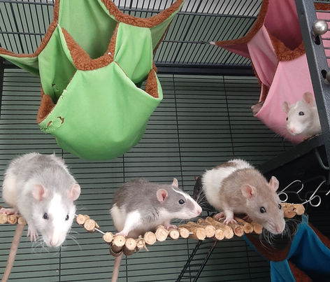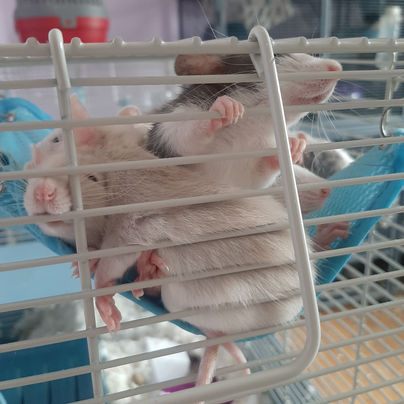 The grow-out cages (blue bottom) include a hammock, wheel, and lots of room to grow and explore! Rat pups typically move on to their forever homes before outgrowing these cages -- but if they don't, they join the resident rats in the main cages.